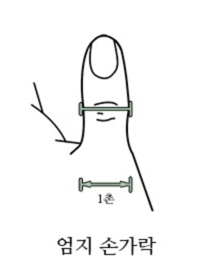 1. 엄지손가락의 안쪽 중간에 있는 관절 가로무늬를 반대쪽 손 범아귀(엄지손가락과 집게손가락의 사이) 입구에 대고 그대로 누르면 엄지손가락 끝이 닿는 부위가 합곡혈입니다.