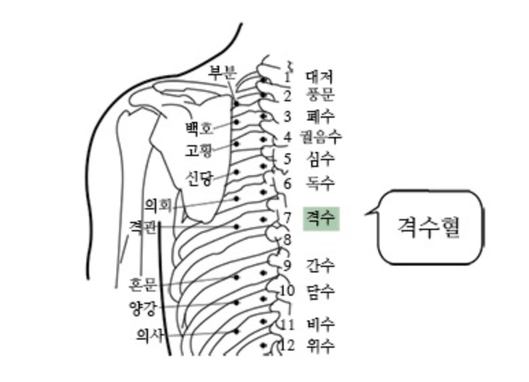 격수혈은 양쪽 날갯죽지 뼈 가장 아랫부분을 잇는 선 상에 있습니다. 등뼈 정 가운데에서 양옆으로 1.5촌 되는 곳에 ㅇㅆ는데, 우리가 흔히 토하려고 할 때 두드려주는 그곳이라고 생각하시면 쉽습니다. 격수혈은 음식이 잘 안 내려갈 때도 도움이 됩니다. 또한, 두드리는 것보다는 엄지를 이용하여 지그시 눌러주는 것이 더 효과적입니다. 혈자리를 정확히 모르겠다면 격수혈 주변을 눌러보아 가장 굳어있는 곳을 자극하면 됩니다.